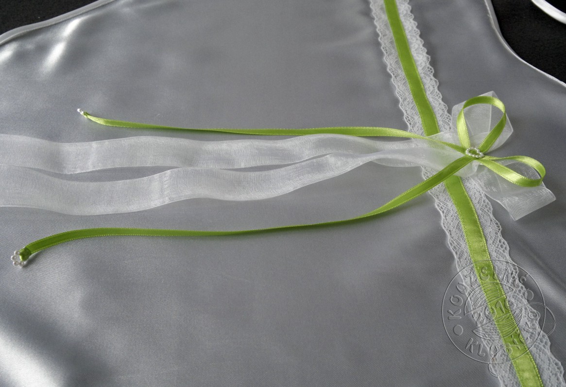 Bryndák pro novomanžele, vyrobený z kvalitního lesklého bílého saténu, zdobený krajkou, atlasovou stuhou, perleťovými plastovými srdíčky a slavnostní mašlí. Mašle je vyrobená z šifonové stuhy a atlasové stužky, přizdobená "zlatými" prstýnky (v nabídce i "stříbrné"), perleťovými kolečky - věnečky a srdíčkem. Je opatřena malinkým zavíracím špendlíčkem. Použity stuhy v odstínu krémová zeleň.