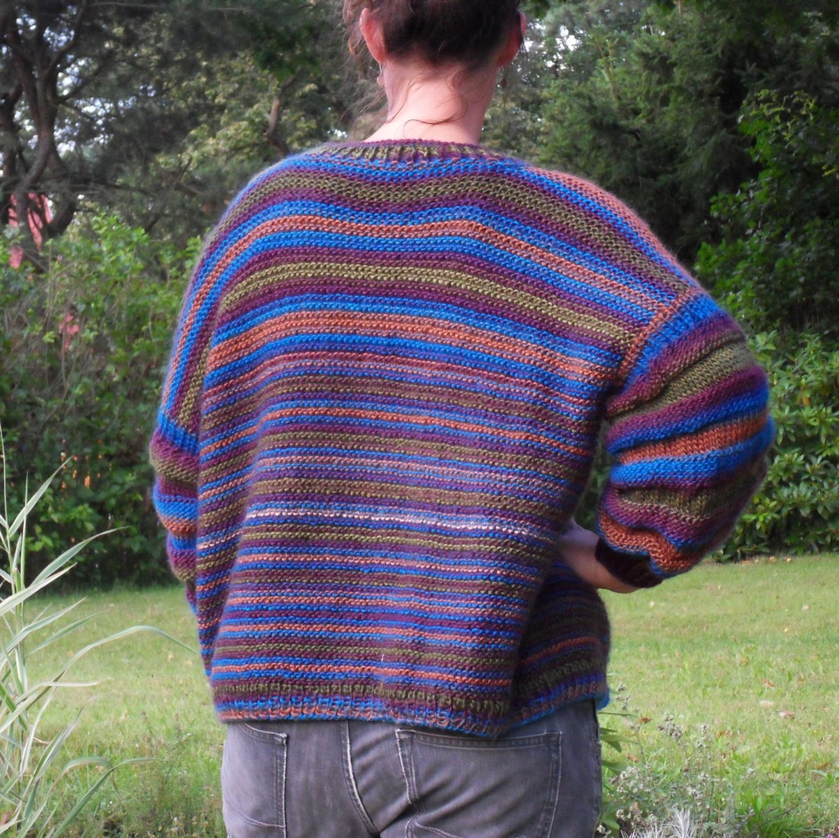 Oversize kardigan z krásné příze. Prolínají se v ní tóny modré, fialové, zelené, rezavé a hnědé barvy. Rukávy jsou široké, nabrané a vzor na nich vytváří tvar "buřtíků".