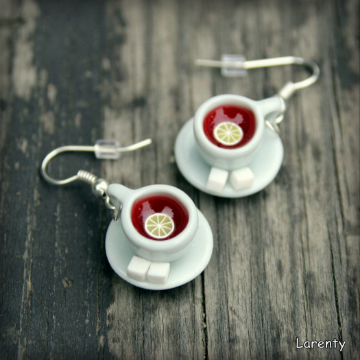 Hrnek plný ovocného čaje dozdobený plátkem citronu naservírovaný na okrasném talířku se dvěma cukříky. Naušničky jsou droboučké a lehké, velikost cca 20 mm.