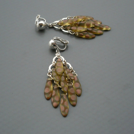 Náušnice jsou tvořeny z uspořádaných transparetních světle hnědých skleněných korálků s bronzovými puntíky do tvaru kosočtverce.