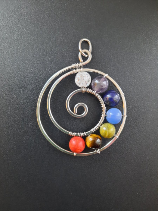Spirála je vyrobena tepáním z chirurgické oceli 316L, ozdobená korálky Křišťálu, Ametystu, Tygřího oka, Lapisu Lazuli, Achátu modrého, Serpentinu a Mořského korálu.
