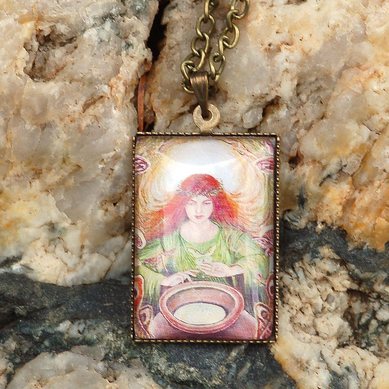 přívěšek z kovu a skla 3,1 x 2,1 cm, mosazný řetízek 50 cm.
