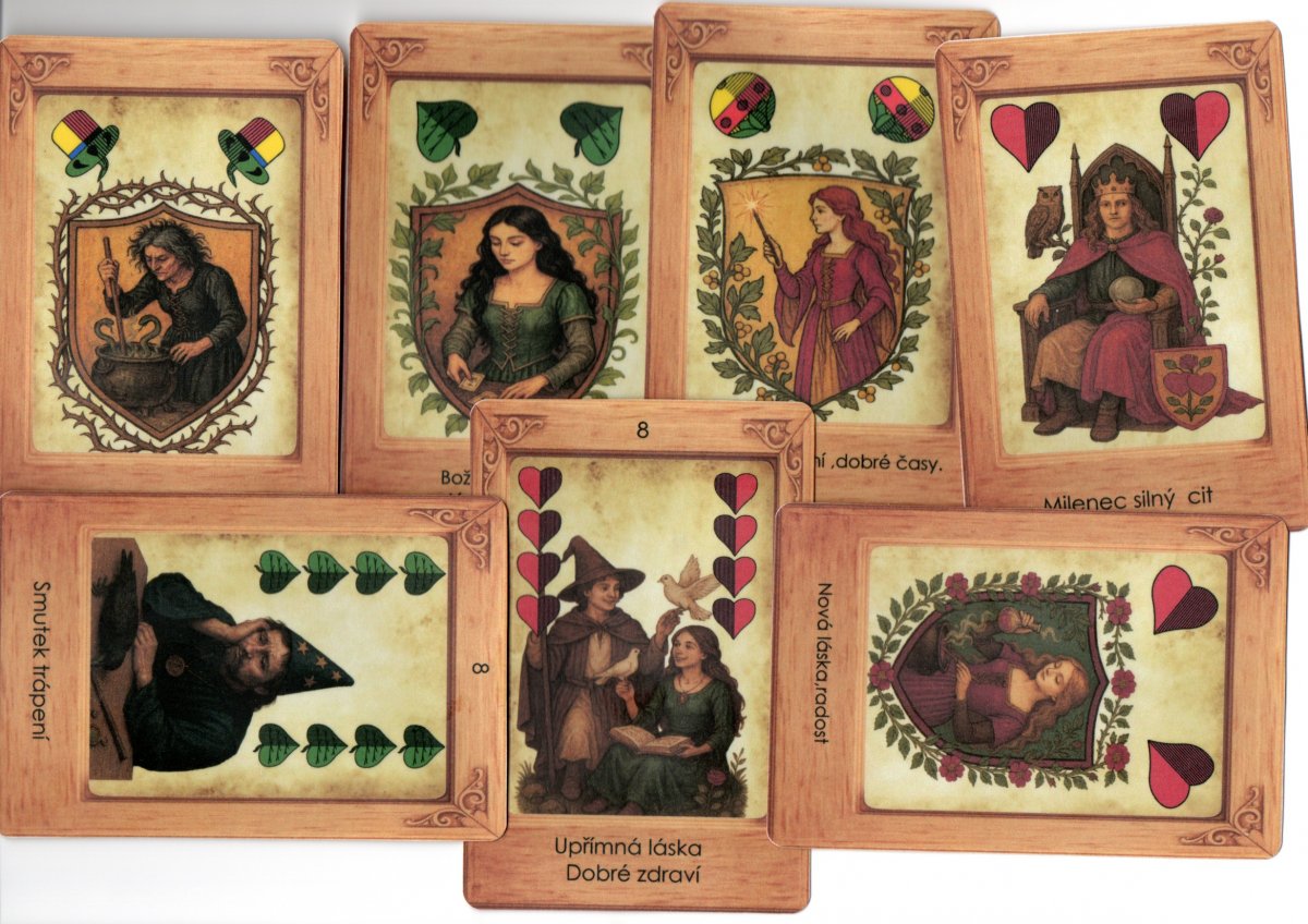 Mariášové karty ČARODĚJNICKÝ SVĚT 32karet s ilustracemi čarodějníc a kouzelníků pro milovníky magie a tajemna , jako vykládací mariášové karty s popisem významu vel: 7,8X11,7cm ruční práce tisk na papír 250g, přelakováno nezávadným lakem pro pevnost a lesk .