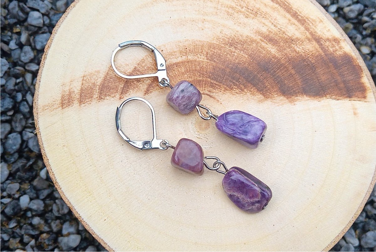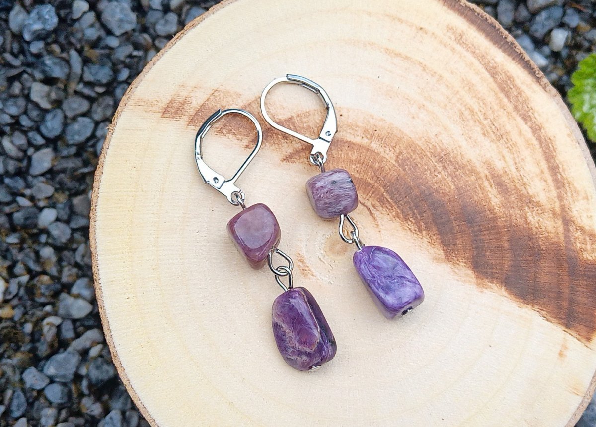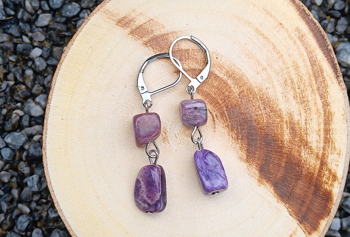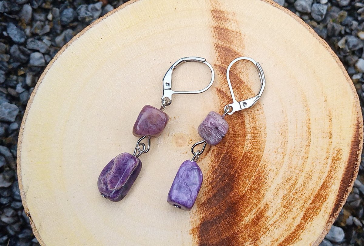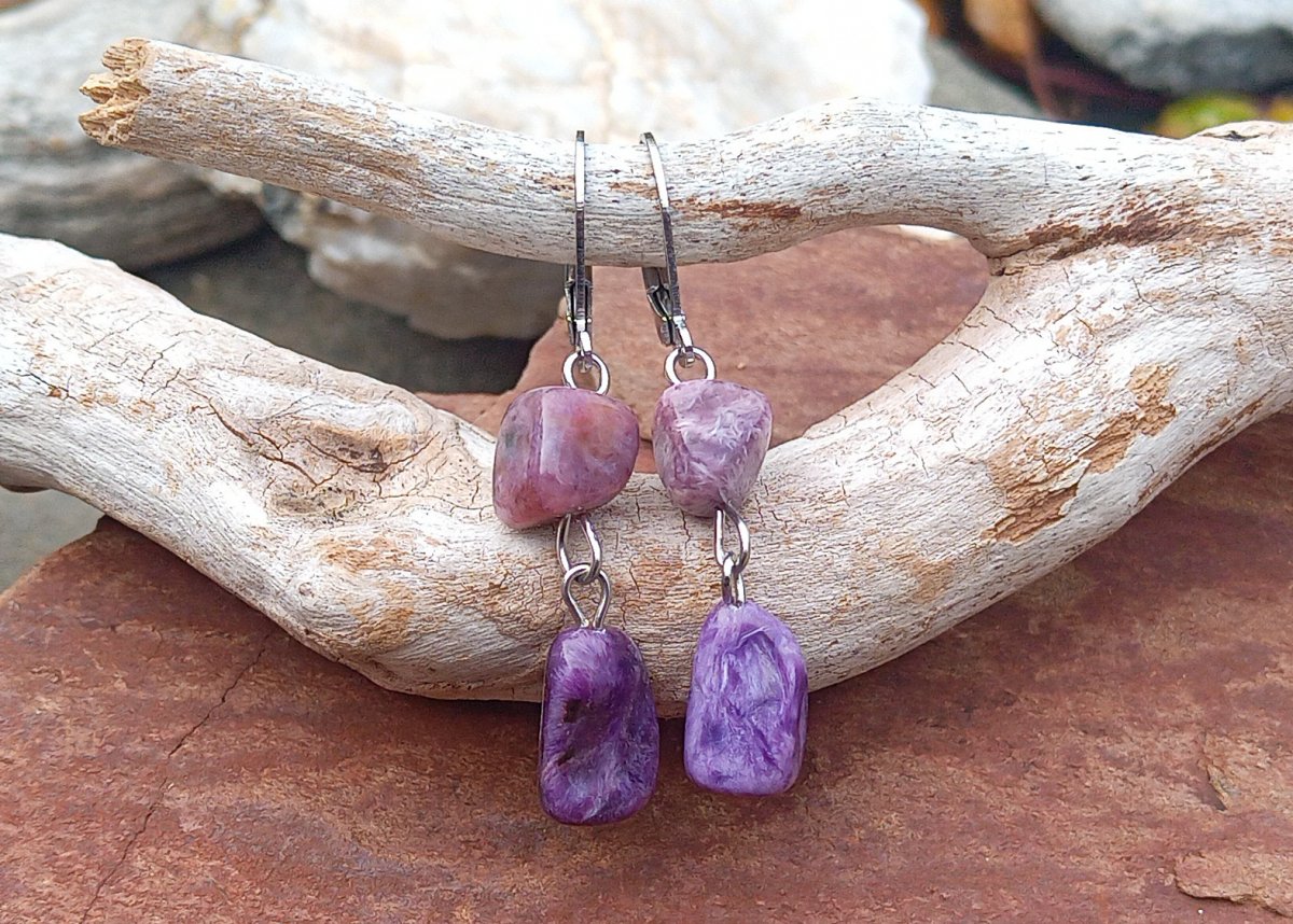 Tromlovaný čaroit o velikosti cca 13 a 8 mm v náušnicích zavěšených na zavíracích háčcích z chirurgické oceli - hypoalergenní, vhodné i pro alergiky. Elegantní náušnice vhodné ke každé příležitosti. Čaroit je nádherně vybarvený. Každý kámen je svým tvarem a velikostí originál