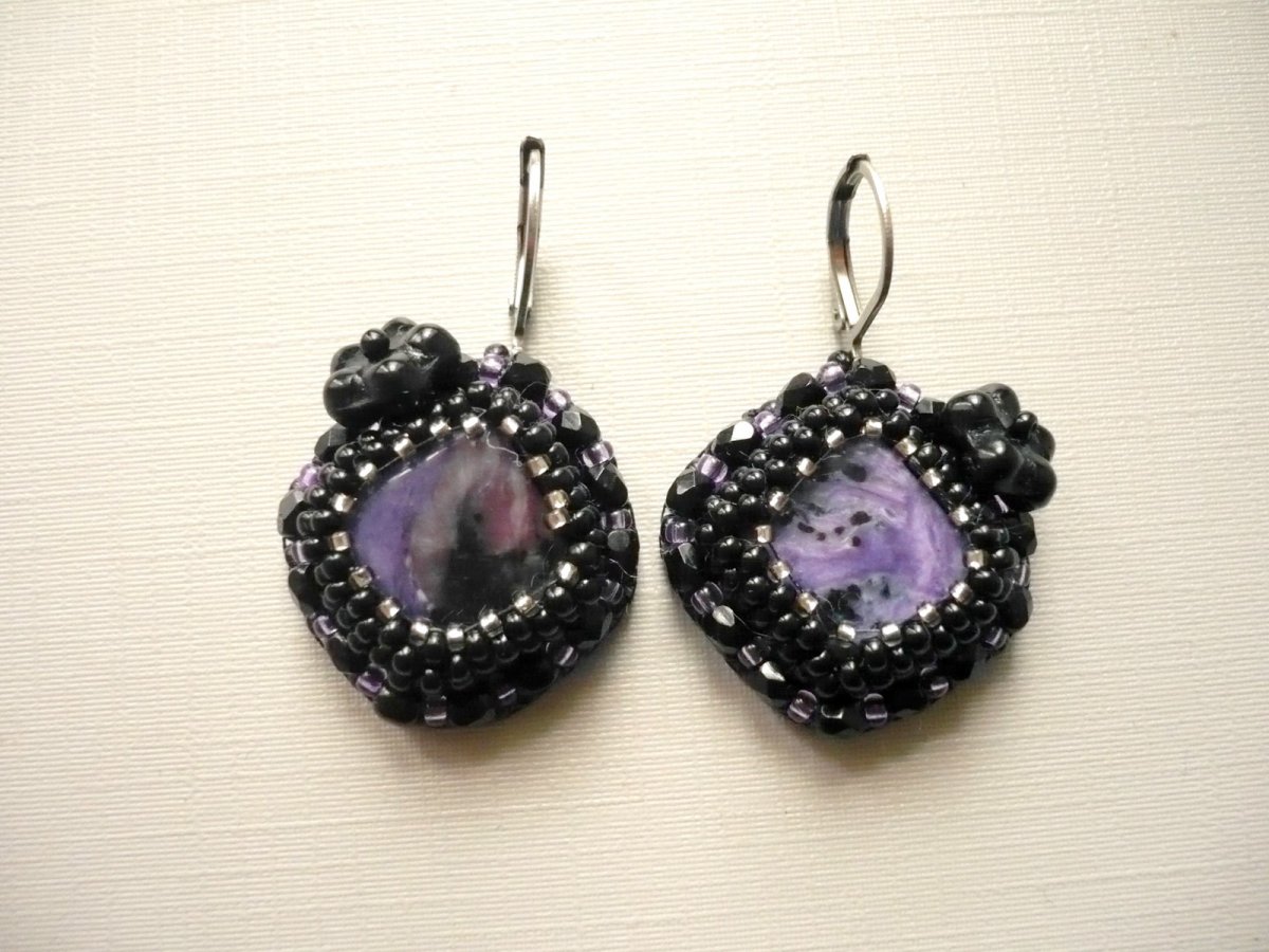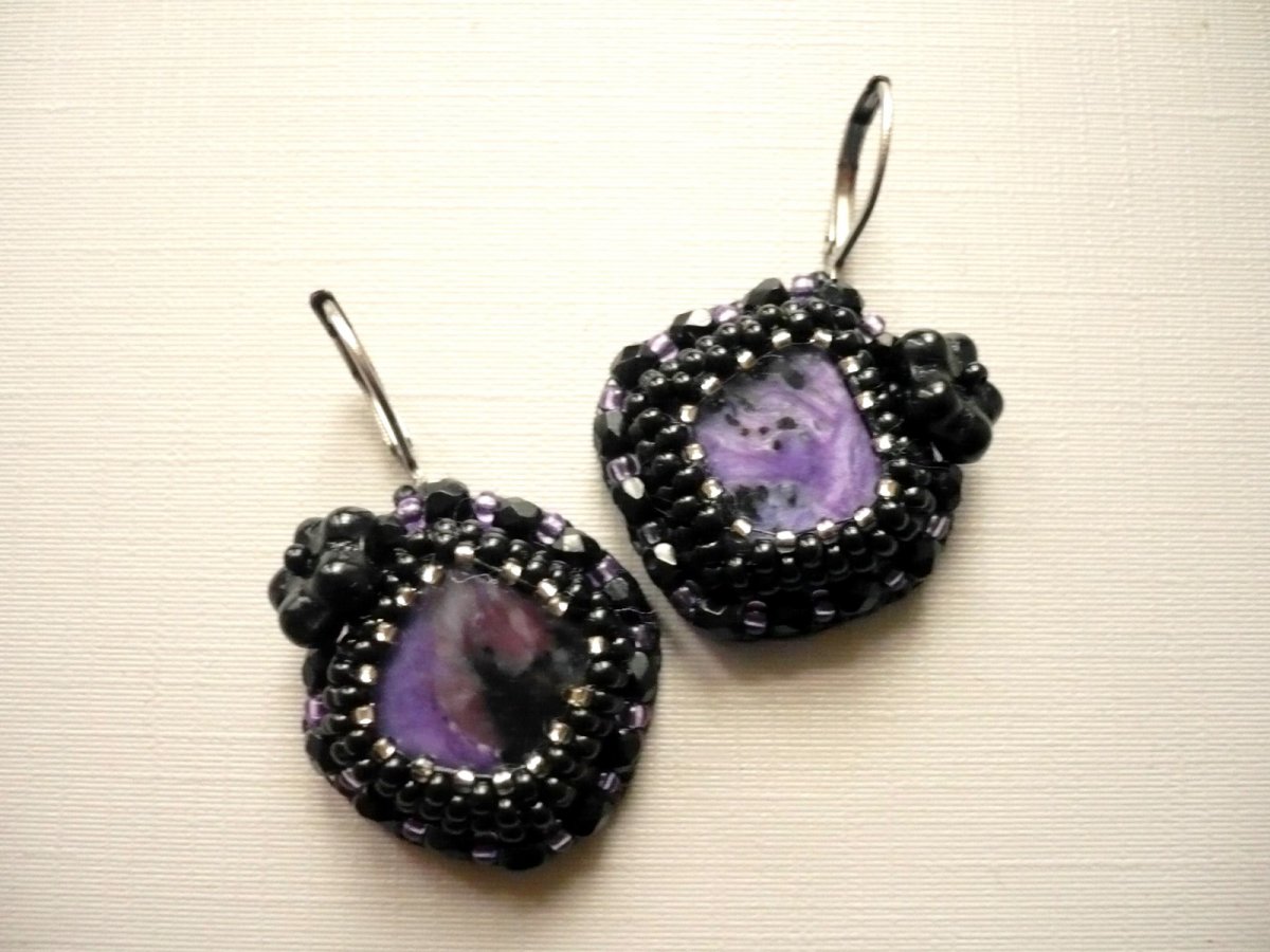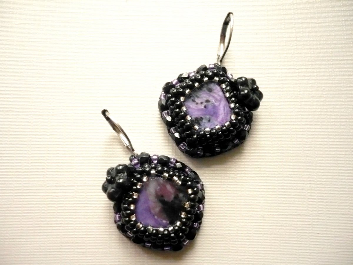 Ručně šité náušnice z rokajlu technikou beadweaving. Uprostřed je kabošon čaroitu. Vše podloženo fialovou plstí, zavěšeno na komponentu z rhodia (je antialergenní). Doplněno černými ohňovkami a skleněnými korálky ve tvaru kytiček. Velikost 2,2 x 2,2 cm bez háčku.