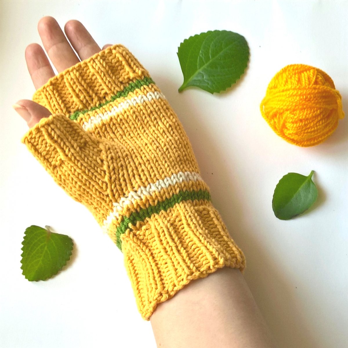 Návleky na ruce - bezprstové rukavice jsou ručně pletené hladkým vzorem s prouřky ze středně silné příze s obsahem bavlny. Nahoře, dole a okolo palce mají pružné lemy.