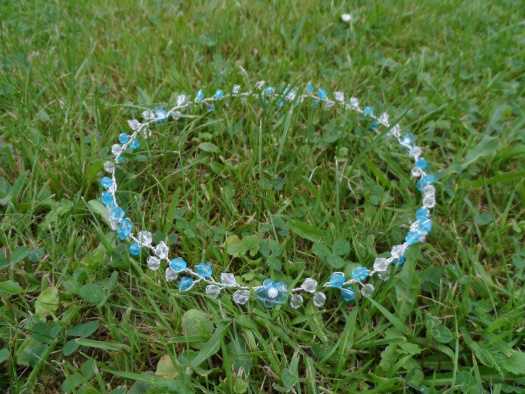 Čelenka / věneček do vlasů jako ideální vlasový doplněk v barvě modré a čiré se stříbrným podkladem, s modrými a čirými květinkami