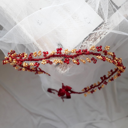 Čelenka/věneček z červených a zlatých korálků o délce cca 44 cm (celková délka včetně saténové stužky je cca 112 cm). Čelenka je tvarovatelná, ukončená červenou saténovou stužkou na zavazování, drátek je zlaté barvy.