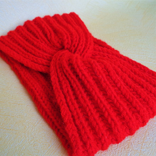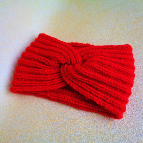 Křížená čelenka pletená dvojitě z akrylové příze výrazně červené barvy. Příjemná na dotek, neškrábe a zahřeje.