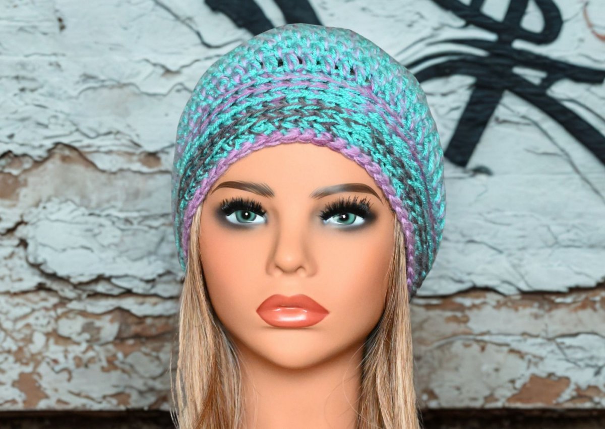 HÁČKOVANÁ ČEPICE V BARETKOVÉM STYLU – TYRKYSOVÁ S RŮŽOVOU