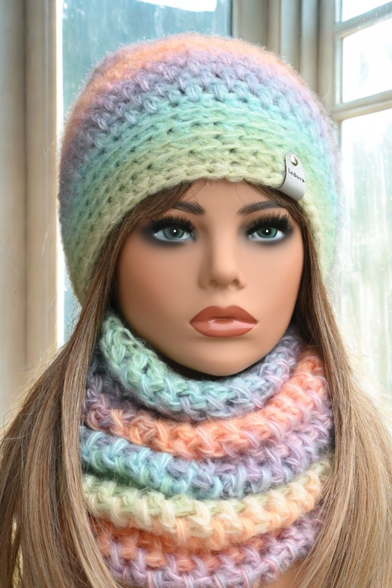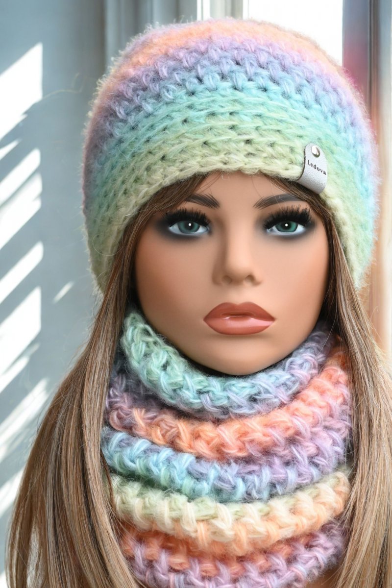 Háčkovaná souprava čepice s nákrčníkem z lehoučké nadýchané chlupatkové příze .