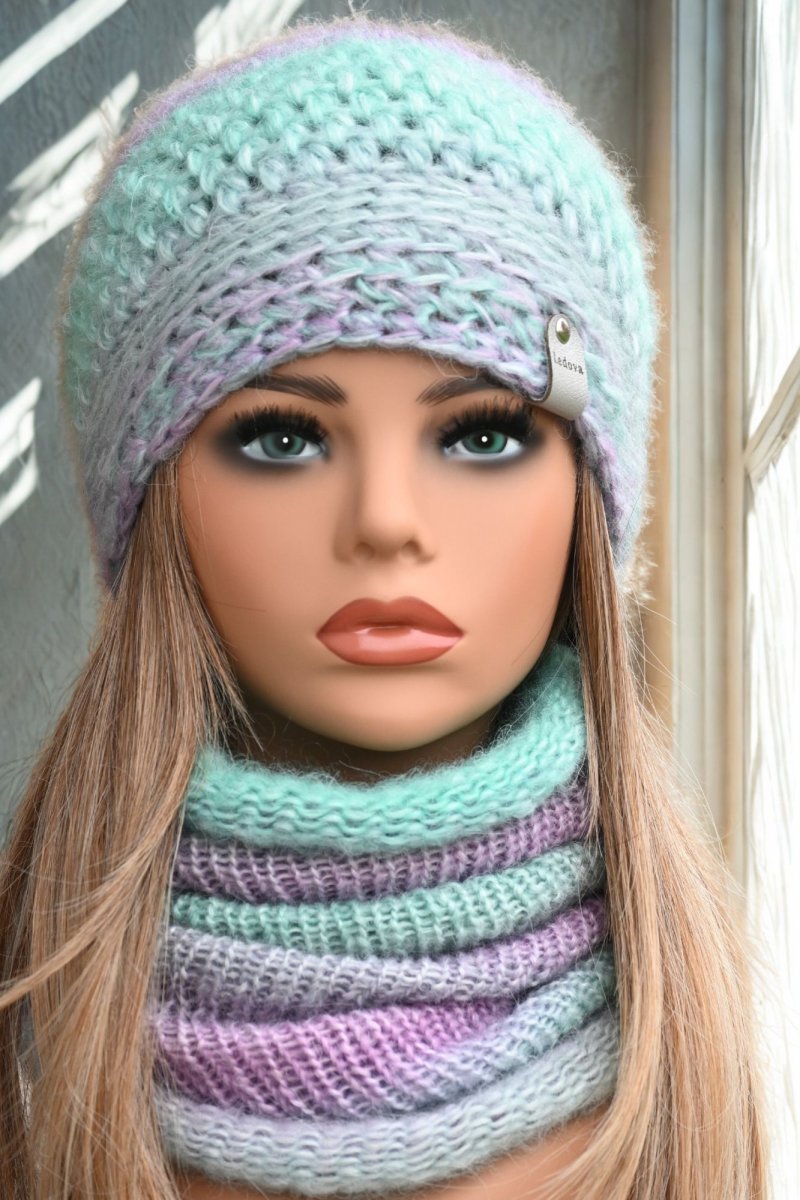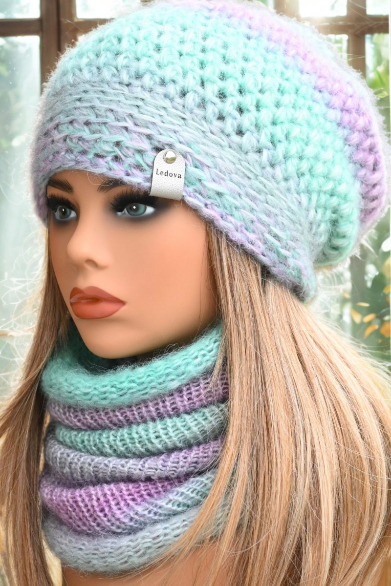 Háčkovaná a pletená souprava čepice s nákrčníkem z lehoučké nadýchané chlupatkové příze v krásných fialovo-mátových barvách.