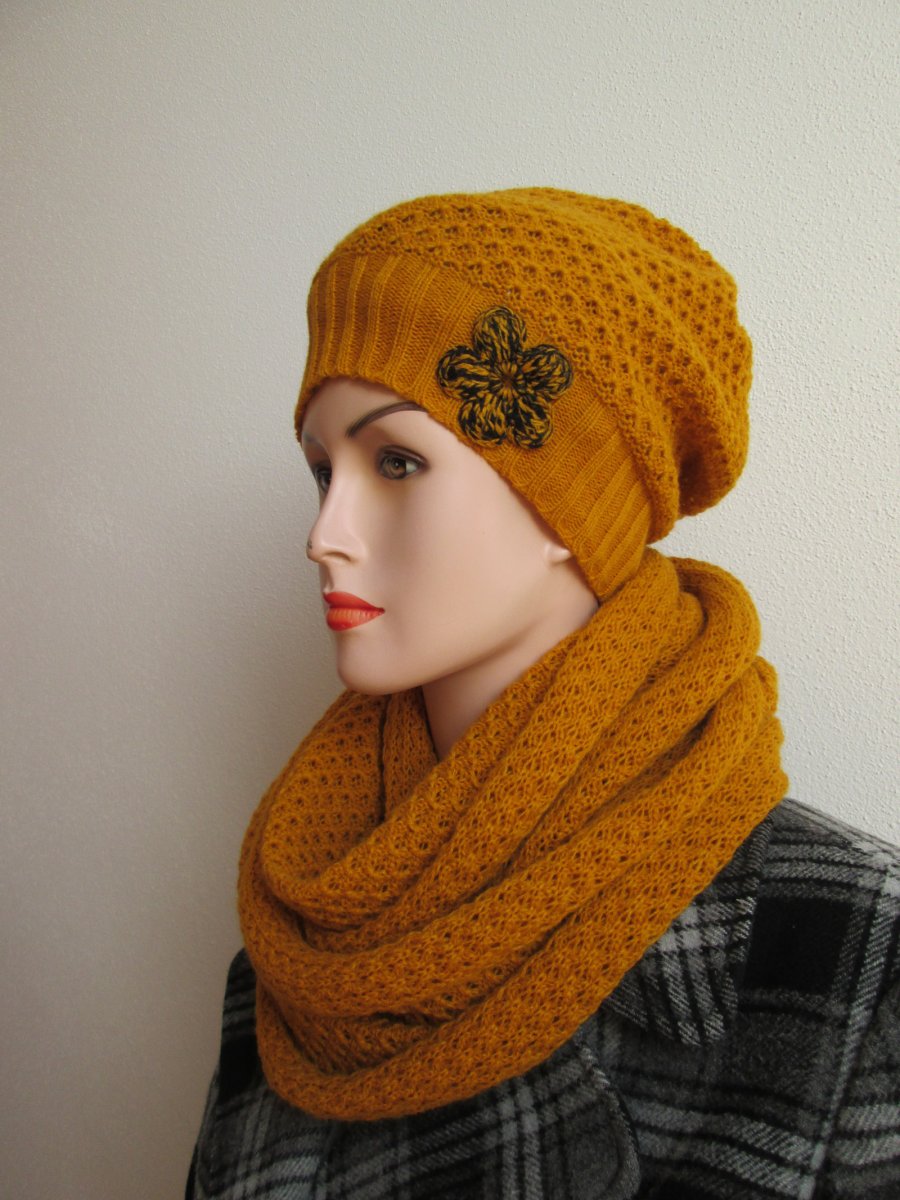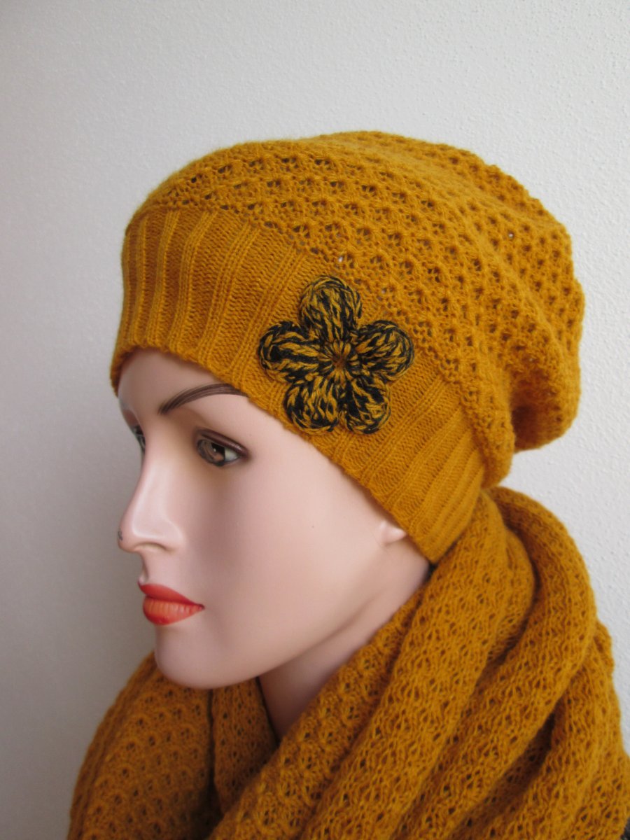Slabší čepice je vzdušná, pletená stejným pavoučkovým vzorem jako nákrčník. Vzadu má šev, je velmi nepatrný, dobře zakrývaný pavoučkovým vzorem. Je ozdobená hačkovanou kytičkou v barvě černá a hořčicová.