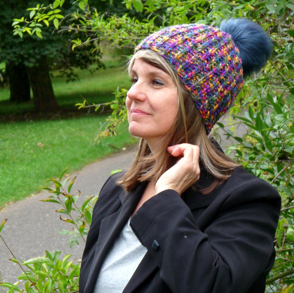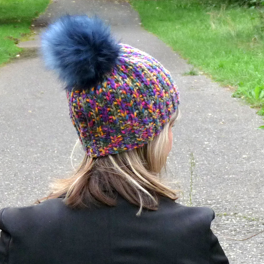 Třešničkou na čepici je pak velká efektní bambule z umělé kožešiny v modré barvě