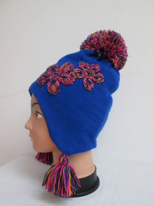 Dvojitá ušanka z akrylové příze, zdobená háčkovanou aplikací.