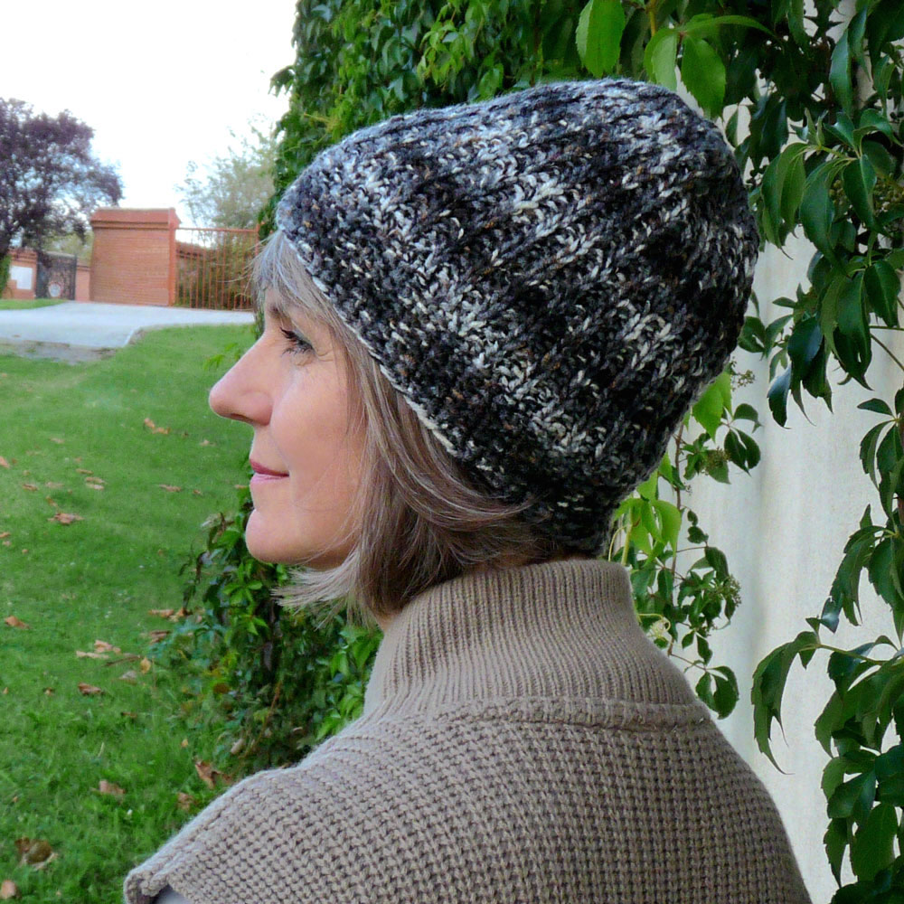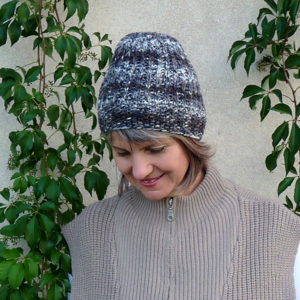 Pletená čepice ze silnější dovozové příze v základní černo-bílé barvě, kterou sem tam doplňuje šedá, hnědá, béžová a smetanová barva