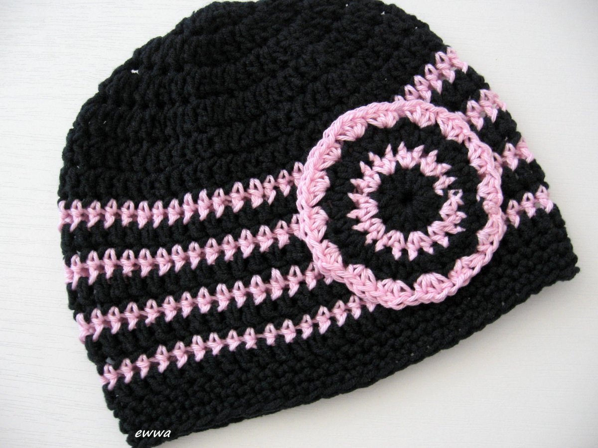 Háčkovaná jednoduchá proužkovaná čepička s aplikací,