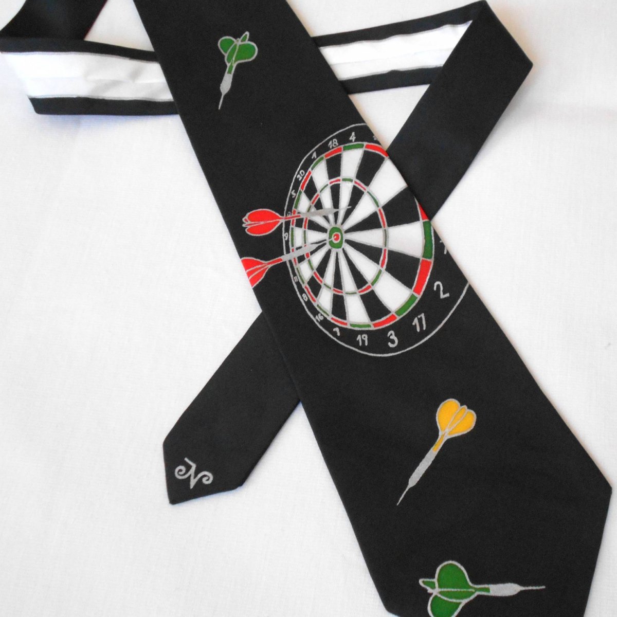 Ručně malovaná hedvábná kravata, černý podklad, na přední straně motiv terče a šipek ve třech barvách, stříbrná kontura, bílá zadní strana, rozměr 9,5 x 140 cm, 100% přírodní hedvábí Habotai 10.