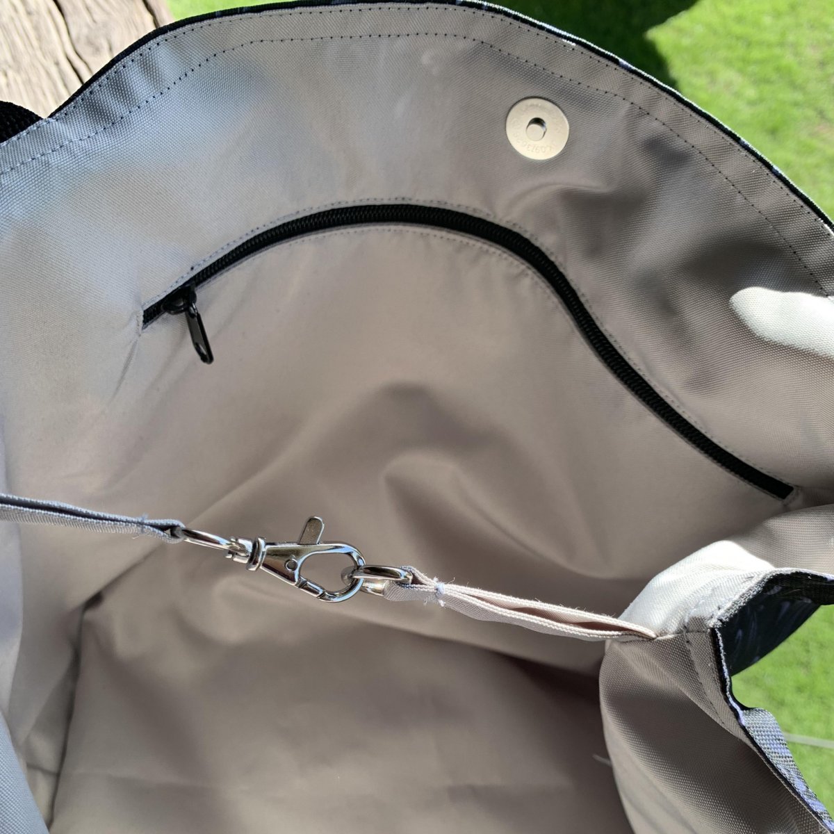 Při sepnutí vnitřní karabiny je taška jako by menší, pokud karabinu otevřete, máte tašku velikou.