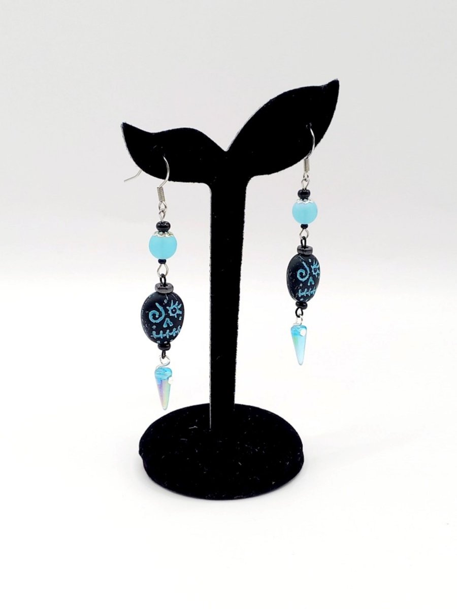 Odvážné, výrazné, nepřehlédnutelné, nezradični náušnice, možná trochu strašidelné nebo malinko morbidní. Tyto ručně ketlované visací náušnice spojují chladnou mystiku černé lebky (1 × 1,5 cm) s chladným kontrastem ledově modrého korálku a koncovky korálku spike.