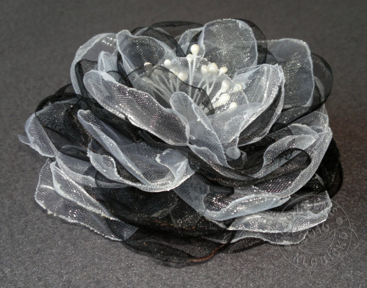 Brož - spona ve tvaru květu, vyrobená z "květinových plátků" organzy bílé a černé barvy, zdobená korálkem a stříbrnými nebo perleťově bílými pestíky, rozměry: průměr cca 10 cm, výška cca 4 cm.