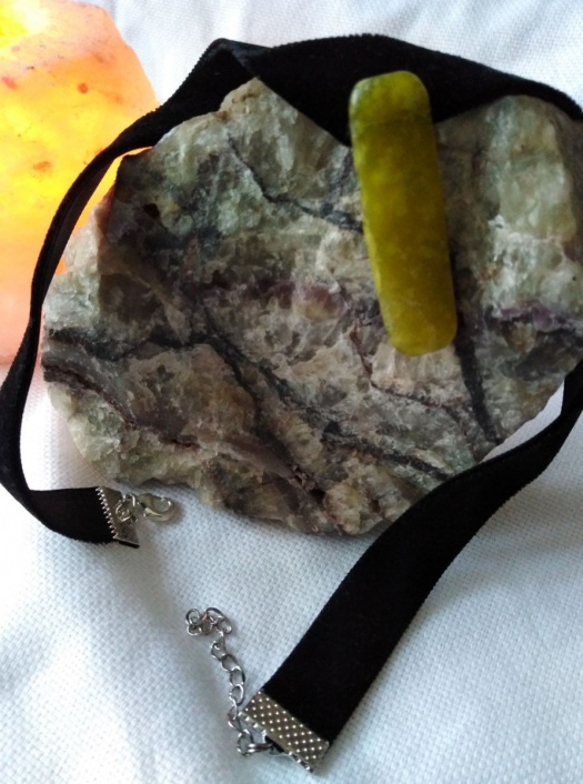 Sametová stužka černé barvy je široká 1,6 cm. Koncovky, prodlužovací řetízek a zapínání je voleno v kovu stříbrné barvy. Sametka je dlouhá cca 36 cm a díky prodlužovacímu řetízku až 41 cm. Sametka je ozdobená nefritem o délce cca 4 cm a šířce cca 1 cm.