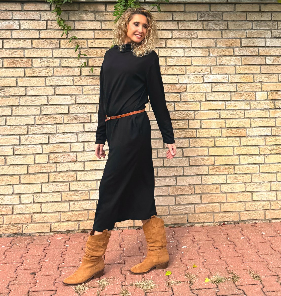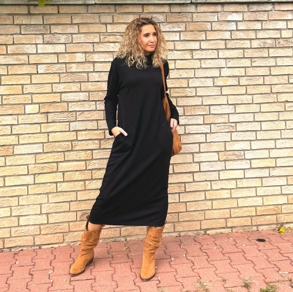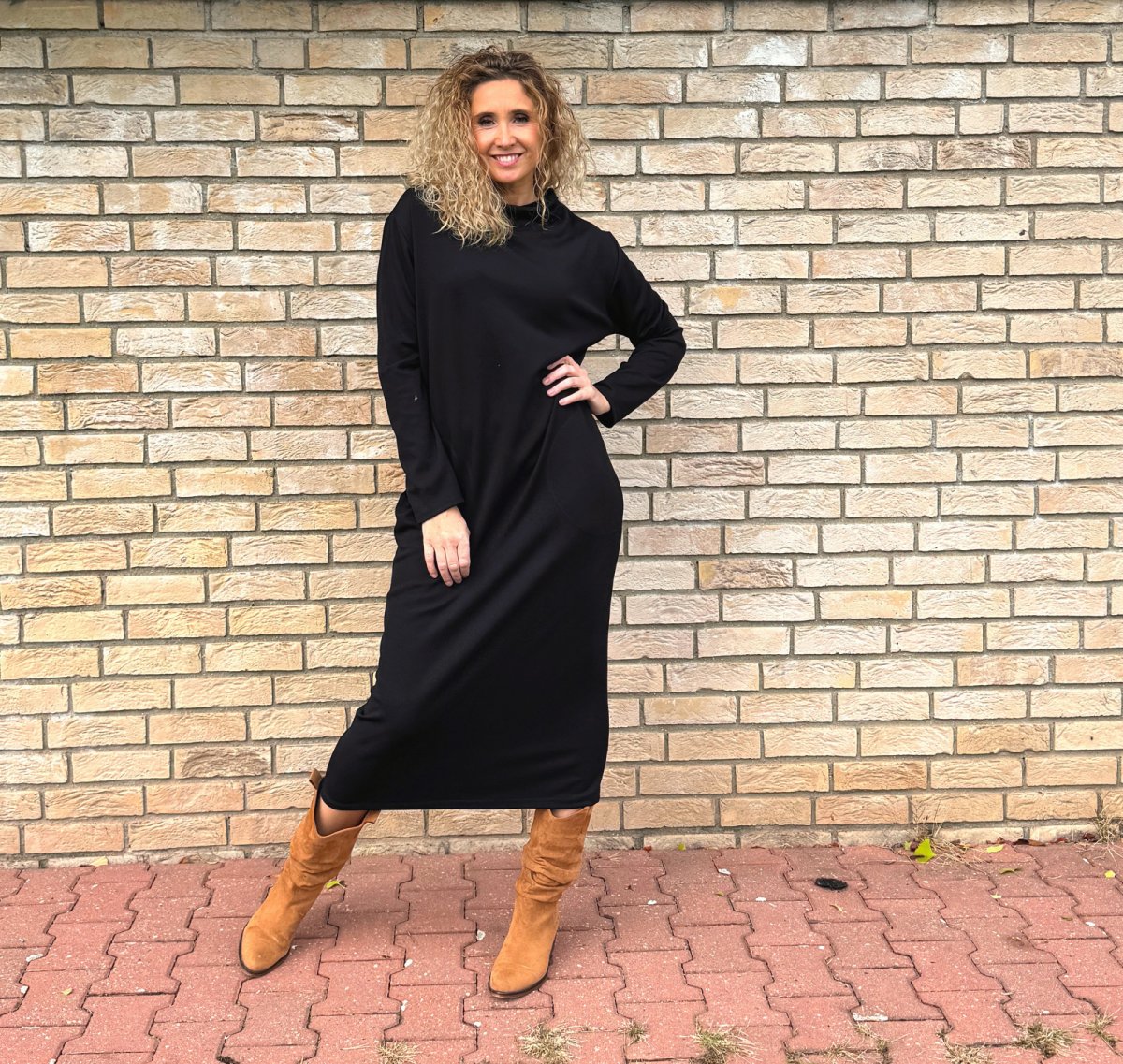 Univerzální pohodlné šaty z úpletu viskóza/polyester/elastan. Na bocích jsou kapsy. U krku je volný stojáček.