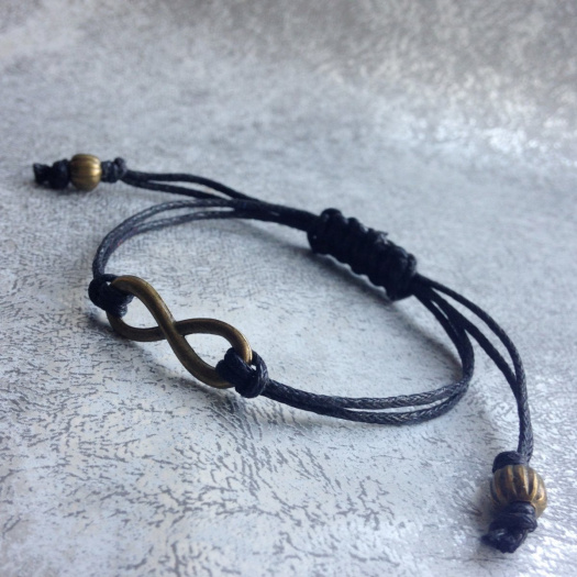 Náramek z černých voskovaných šňůrek se symbolem nekonečna v barvě mosazi - běžný kov.Univerzální velikost - náramek je nastavitelný díky uzlíku a vhodný na dámskou ruku. Pokud chcete náramek pro muže, napište mi, udělám náramek volnější