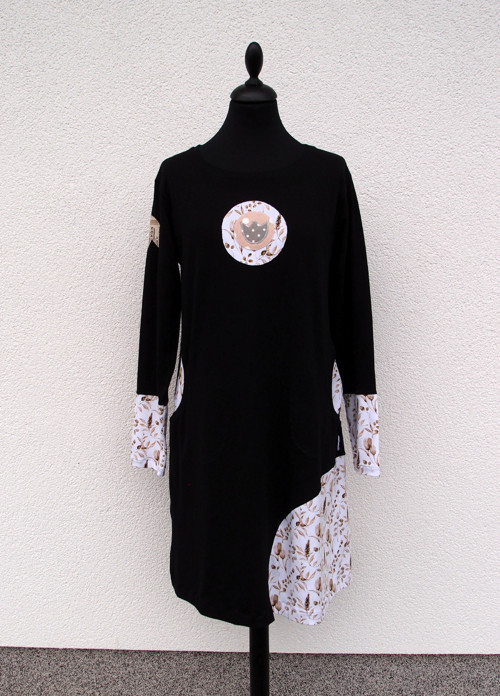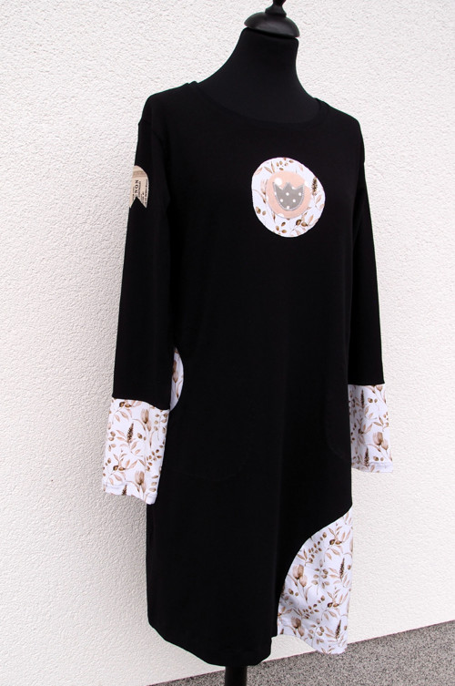 Dámské šaty z černého úpletu v biokvalitě. Doplněné jsou bílým úpletem s motivy obilí a travin a tulipánů. Na předním i zadním dílu je našitá aplikace, také na rukávu. Rukávy jsou půlené, dole založené a ozdobně prošité. Šaty mají dvě kapsy také ozdobně prošité. Dole jsou šaty založené do tunýlku a lze v něm provléknout šňůrku a nosit je lehce stažené do balonku. V pase jsou lehce projmuté. Na spodním dílu je hezky vsazen ozdobný díl.