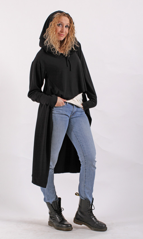 Volné triko s dlouhým zadním dílem ze středně silného úpletu. Doplní džíny ale i sukni. Univerzální kousek pro oživení outfitu. Má extra dlouhé rukávy a velkou kapuci.Velikost univerzální