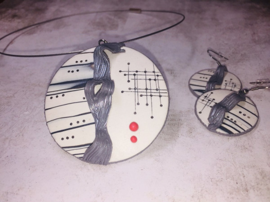 Zavěšen je na bižuterním lanku, Náušnice jsou visací kruhy o vel. 3.5cm