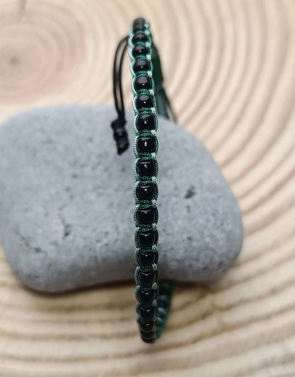 Náramek je vyroben z nylonové šňůry černé barvy. Dále světle a tmavě zelené tenké nylonové šňůry.