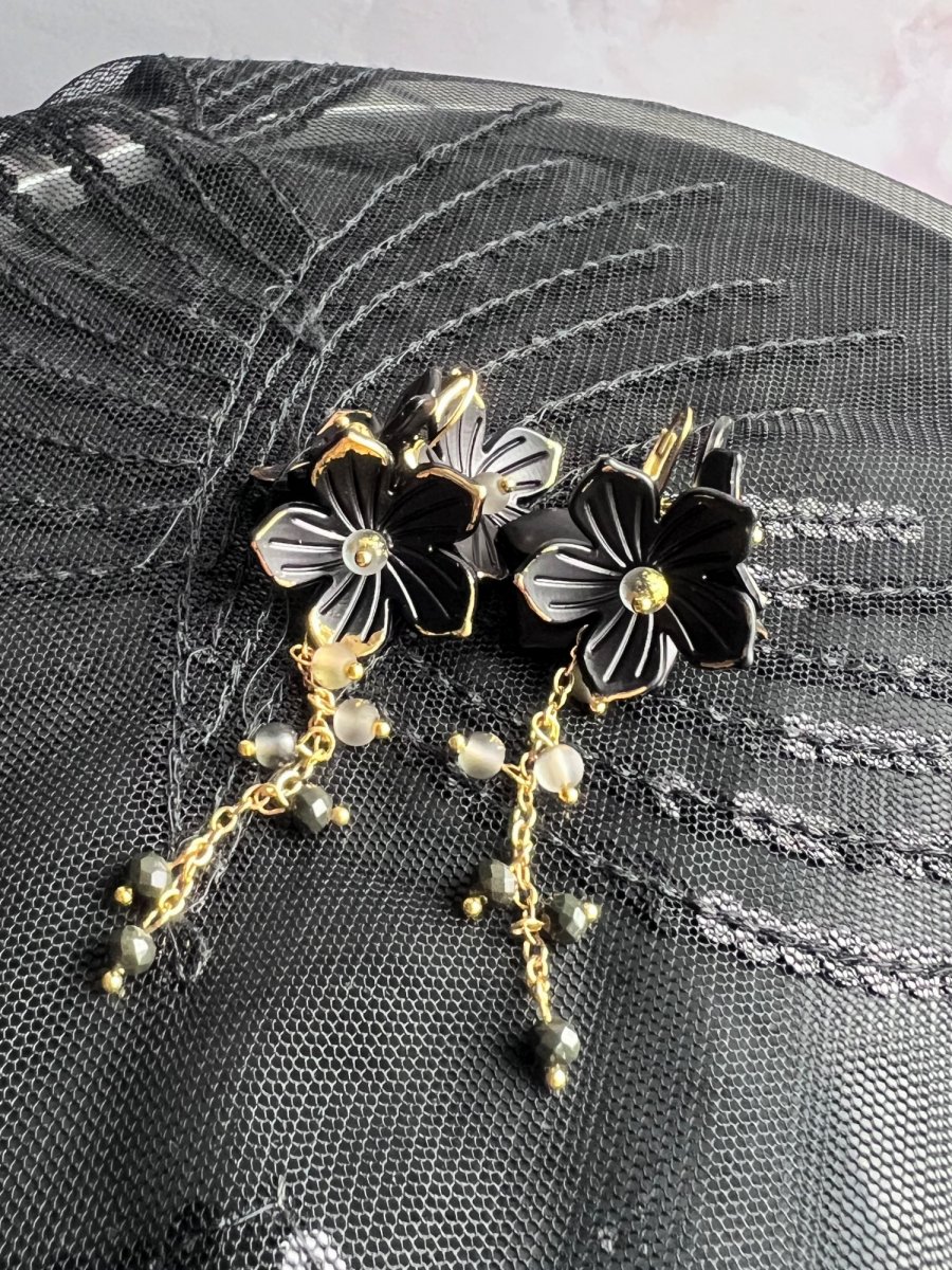 Dlouhé náušnice s plastovými květinkami a drobnými broušenými korálkami na pozlacených kroužkách a řetízku. Délka od háčku cca 6 cm, uzavíratelný háček z nerez oceli