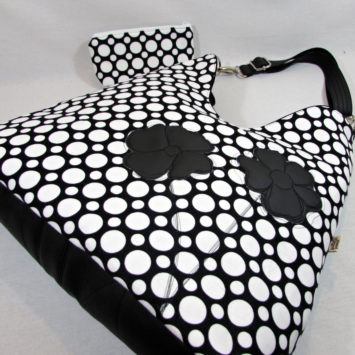 ušitá z bavlněné látky s kolečky v klasické černobílé kombinaci a černé koženky