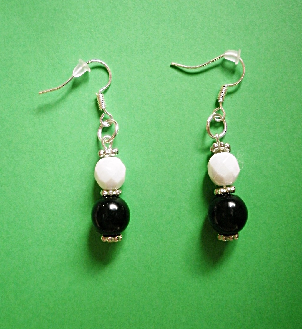 náušnice ketlované z černých a bílých korálků, mezi nimi jsou stříbrné kovové mezičlánky, délka je 2cm, stříbrné komponenty, gumové zarážky