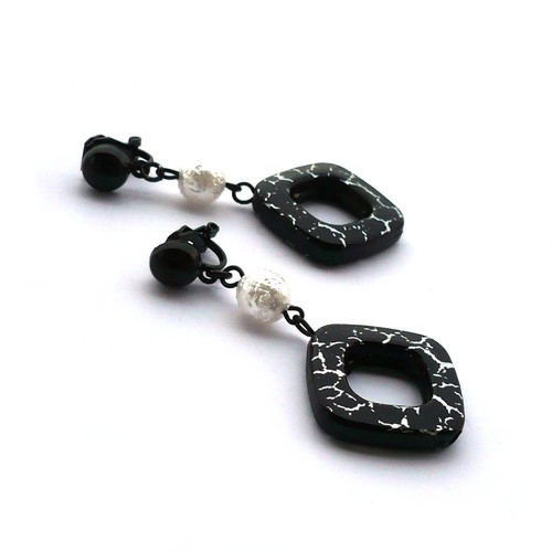 Jednoduché klipsové náušnice (není potřeba mít propíchnutá ouška) jsou tvořeny horní bílou voskovanou perličkou s ozbobně zvrásněným povrchem. Ve spodní části je umístěný plastový čtverec s vykrojeným středem a jemnou stříbrnou kresbou, která je jak na přední, tak i na zadní straně.