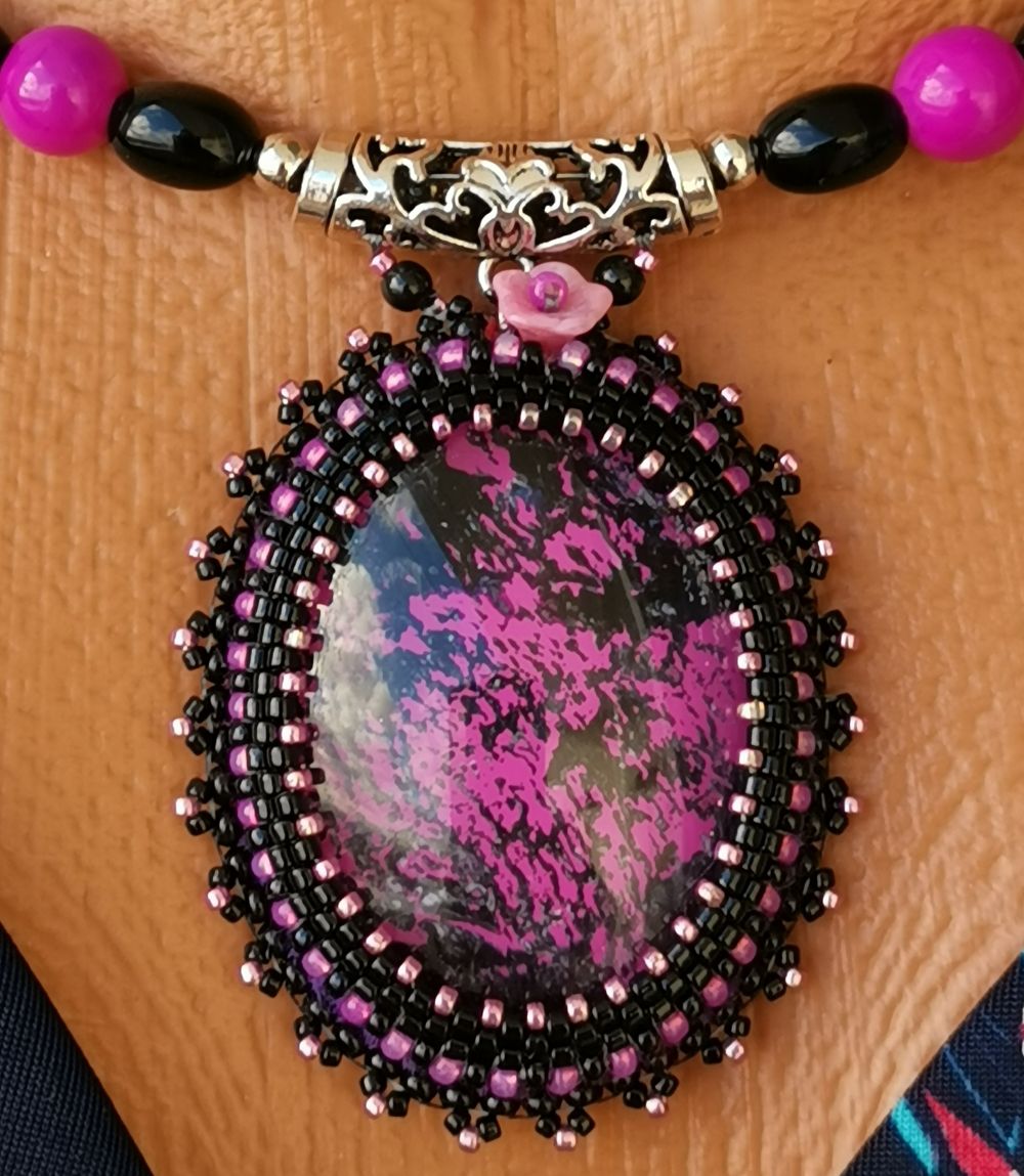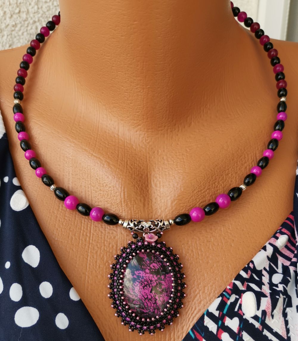 Náhrdelník navlečený na ocelové obruči s obšitým kabošonem v barvě černé a růžové. Náhrdelník si díky obruči na krku neustále drží svůj oblý tvar a dobře se nosí. Kabošon jsem obšila drobnými japonskými korálky TOHO a Miyuki Delica. Bižuterní komponenty a francouzské zapínání jsou v barvě platiny.
