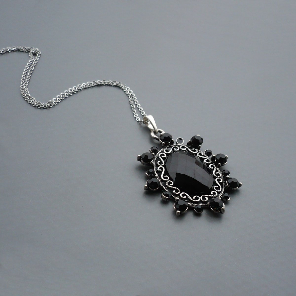 Černými broušenými skleněnými kamínky zdobený oválný kovový přívěsek je umístěný na řetízku z nerezové oceli.