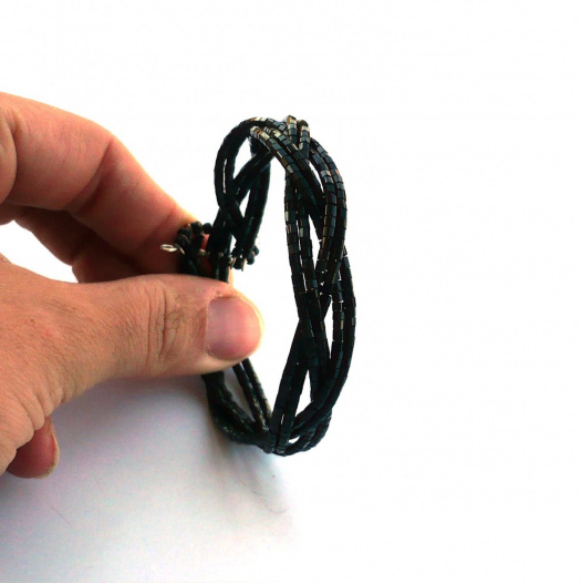 Náramek je tvořený z několika propletených řad drobných černých perleťově lesklých neprůhledných skleněných korálků.