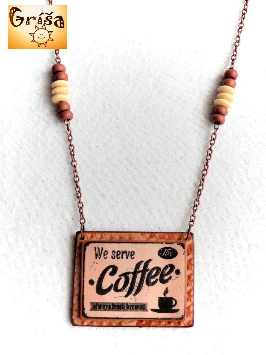 Zavěšeno na bižuterním řetízku měděné barvy o délce 48 cm se zapínáním na karabinku.
