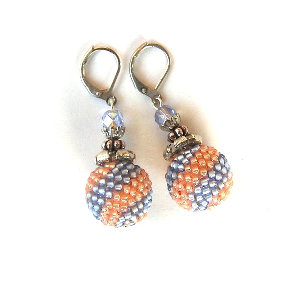 Jemné náušnice z obšívaných kuliček v barvě světle modré a světle oranžové, doplněny kovovými ozdobnými komponenty a broušeným korálkem.