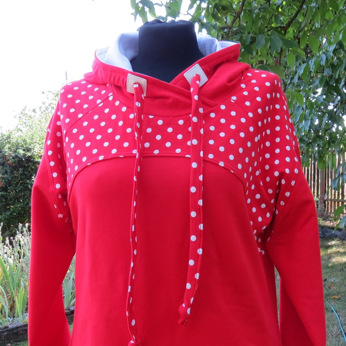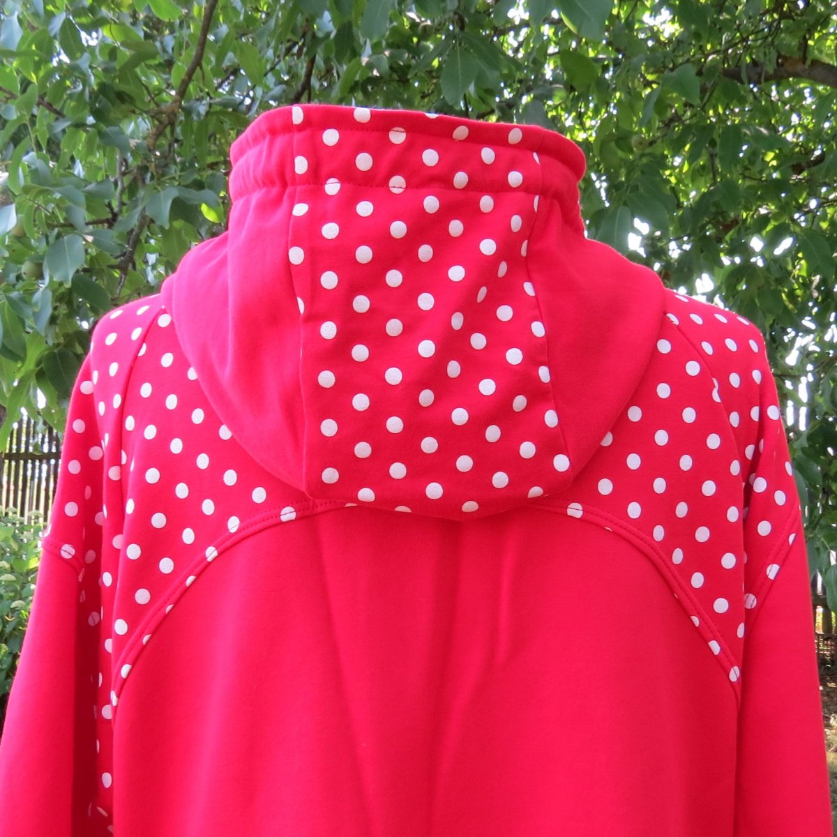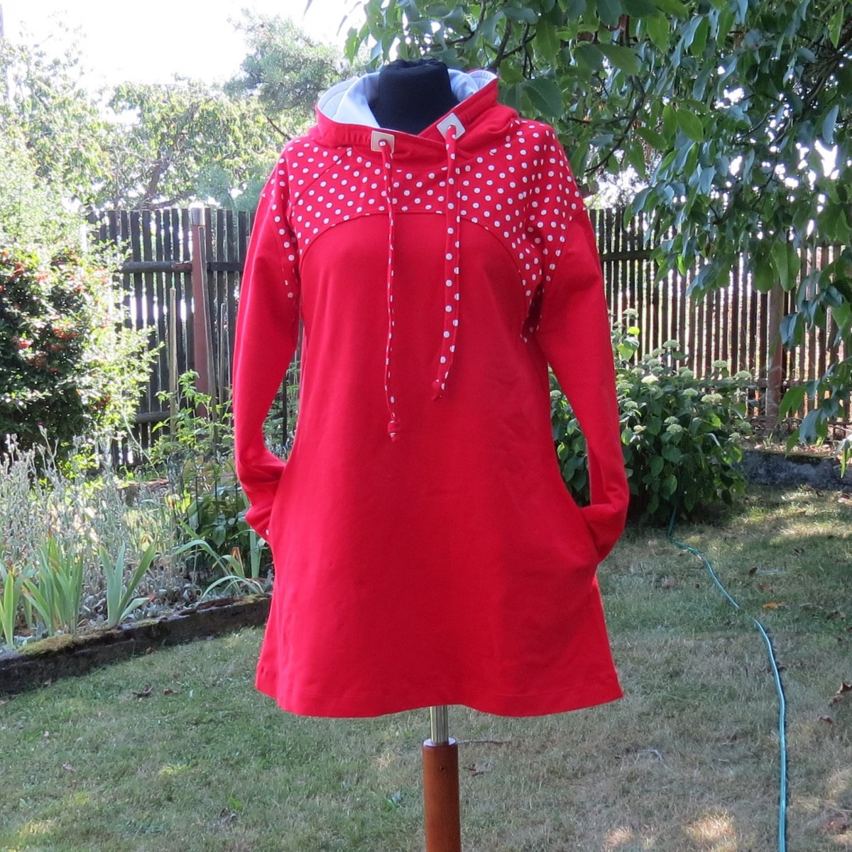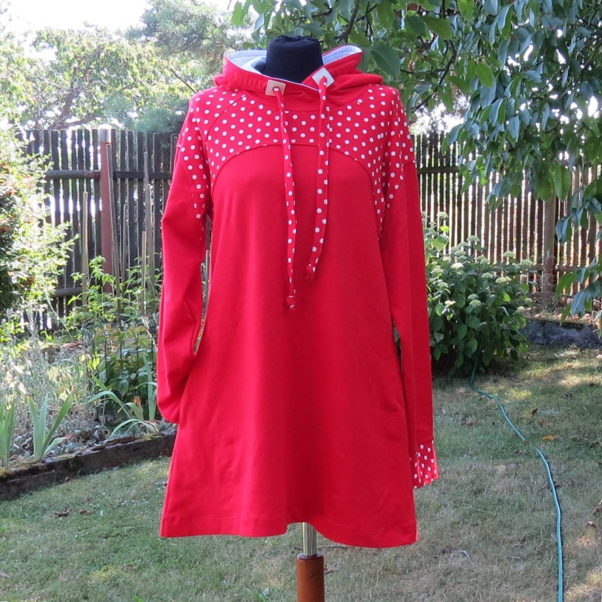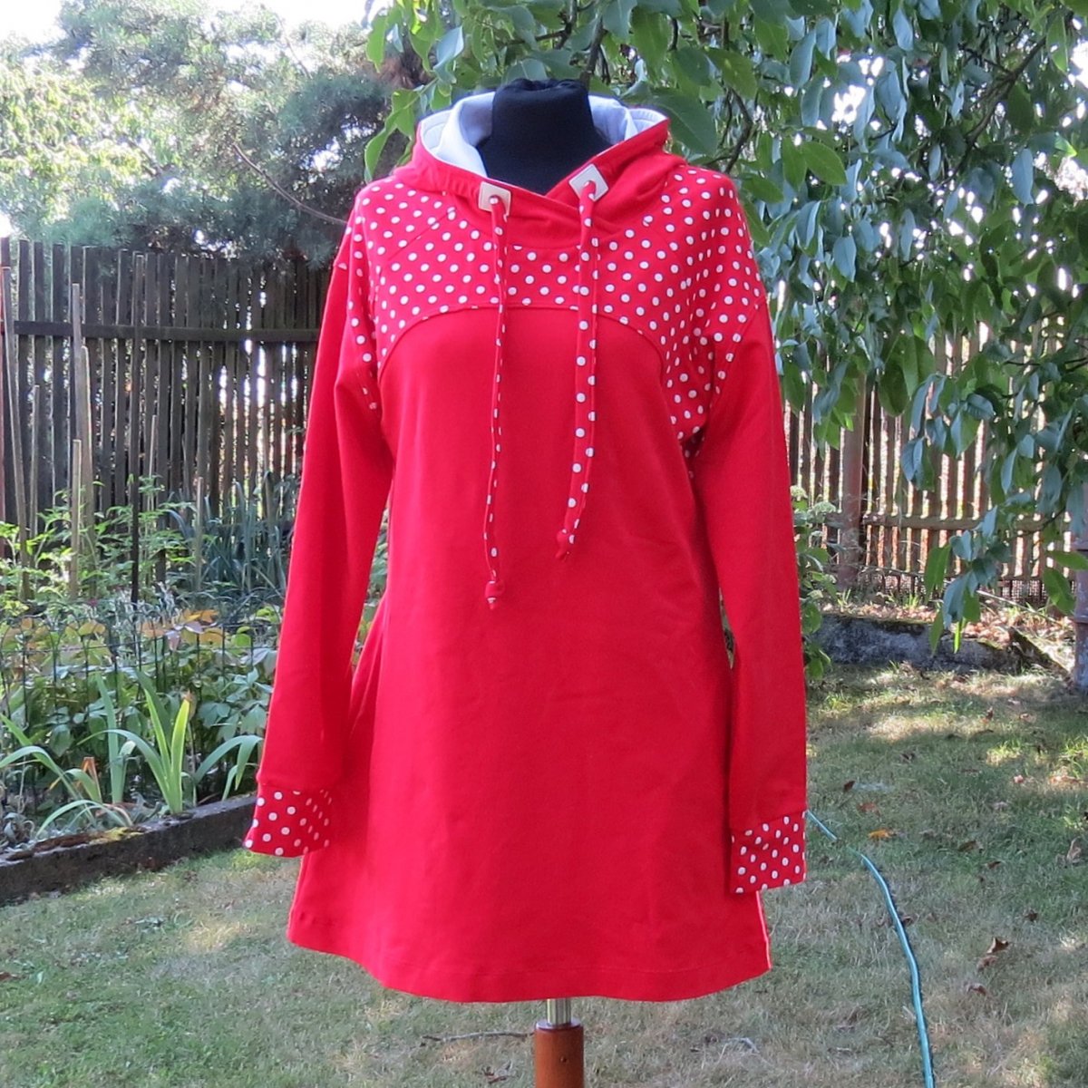 Mikinošaty pro volný čas, pohodu, do přírody i do města. Jsou ušité z červené teplákoviny, sedlo, horní část rukávů, manžety a střední díl kapuce jsou z červené teplákoviny s bílými puntíky. Vnitřek kapuce je bílý. Mají rozšířený střih do A a raglánové rukávy.. Mají velkou kapucu se stahováním tkaničkou z červené teplákoviny s puntíky. V bočních švech jsou kapsy.