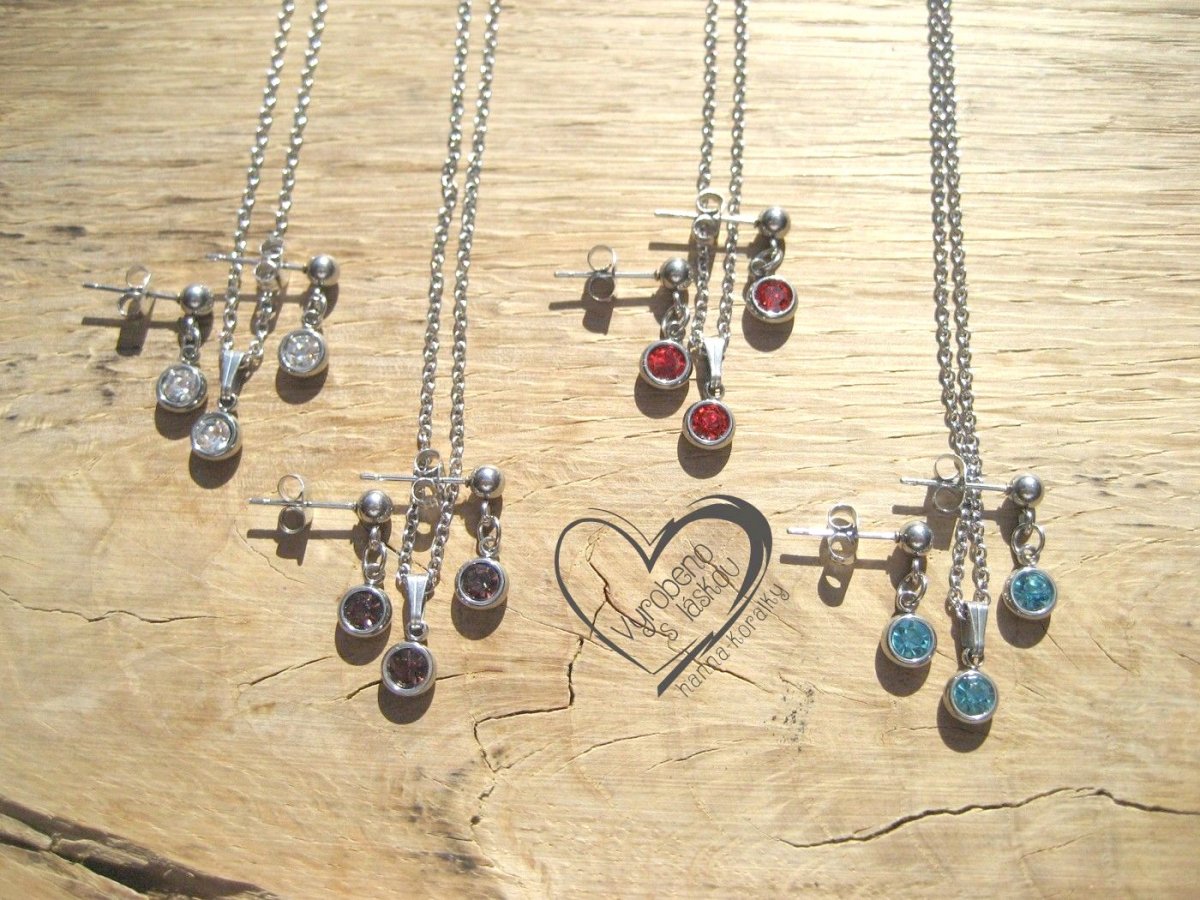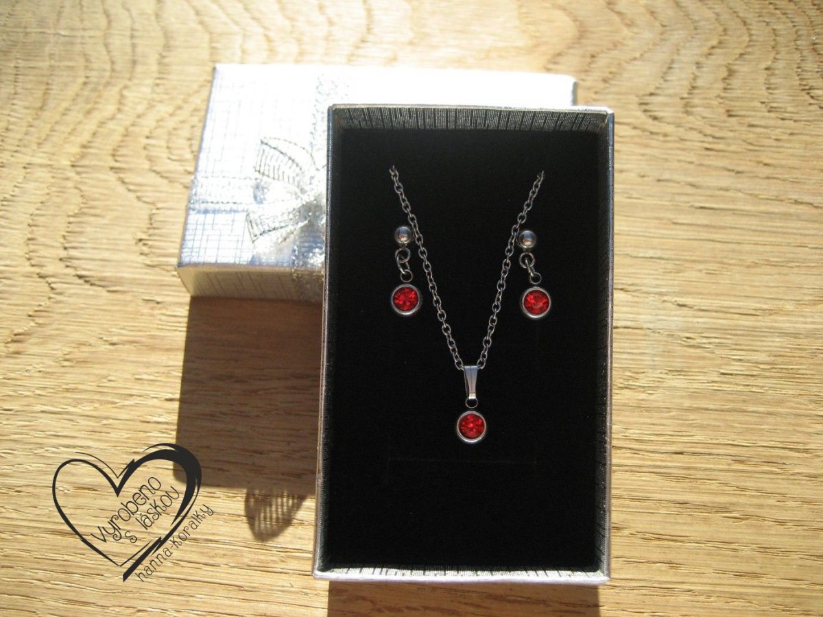 Jemná, jednoduchá a přitom elegantní sada řetízku a náušnic z nerez oceli s červeným skleněným korálkem, délka řetízku 45 cm, průmer přívěsku 5 mm