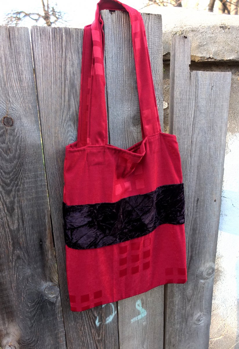 - červeno-vínová látková taška přes rameno sčerný sametovým pruhem