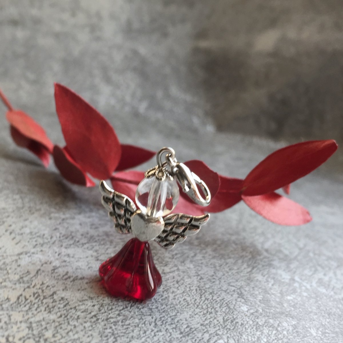 Andělský přívěsek na klíče, na kabelku nebo na baťůžek. Andílek je ze skleněných korálků a kovových komponentů v barvě platiny. Celková délka vč. karabinky 4 cm, andílek má 3 cm