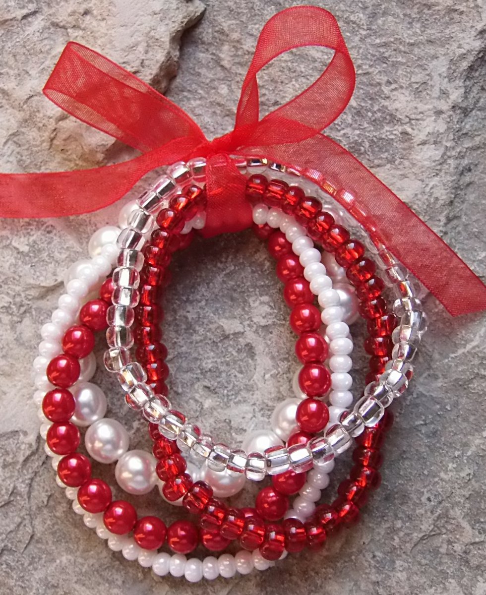 Náramek je vyroben z voskovaných perliček a rokajlu české výroby navlečených na pružence a svázaných stuhou z organzy. Je 16 cm dlouhý.