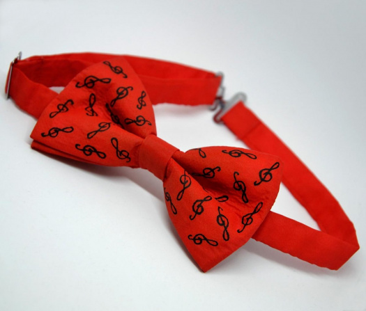 Ručně malovaný červený hedvábný motýlek shouslovými klíči namalovanými černou konturou, 100% přírodní hedvábí, rozměr 11,5x6 cm.