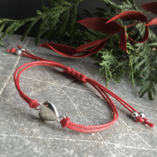 Náramek z červených voskovaných šňůrek se stříbrným srdíčkem - běžný kov.Univerzální velikost - náramek je nastavitelný díky uzlíku a vhodný na dámskou ruku.