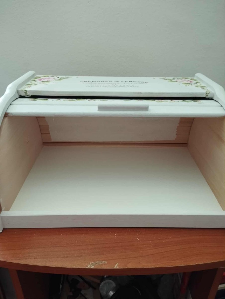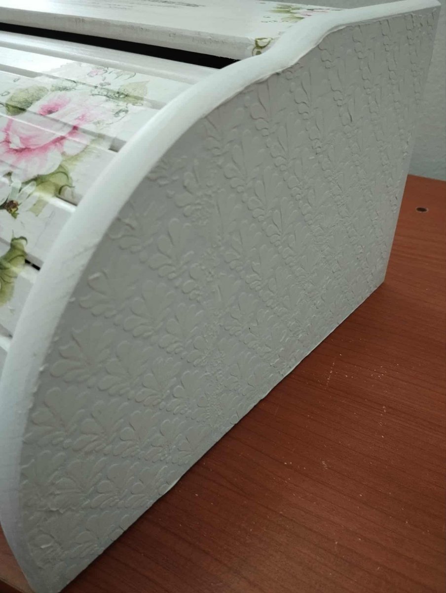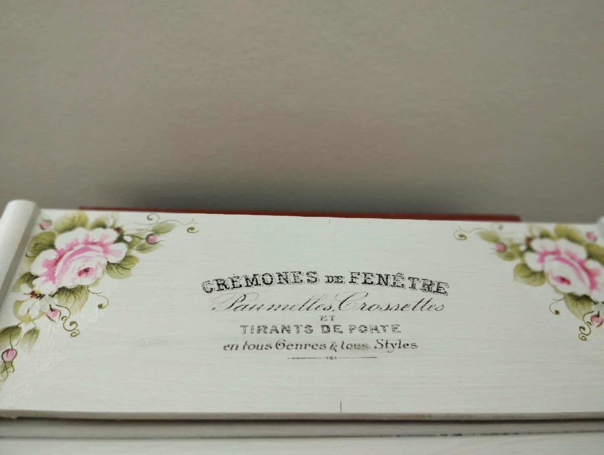 Vyroben z bukového dřeva. Vnitřní a zadní strana sololit. Je zdobený technikou decoupage, po stranách jemná patina , natřeny akrylovými barvami s atestem na potraviny .