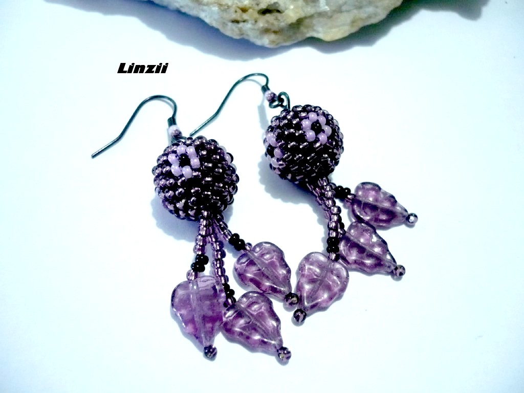 Ručně šité náušnice z rokajlových korálků Jablonex ve fialové barvě. Na každé kuličce jsou vyšity čtyři kytičky. Uvnitř kuličky je dřevěný korálek. Doplněno komponenty v černé barvě.